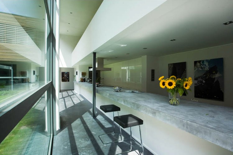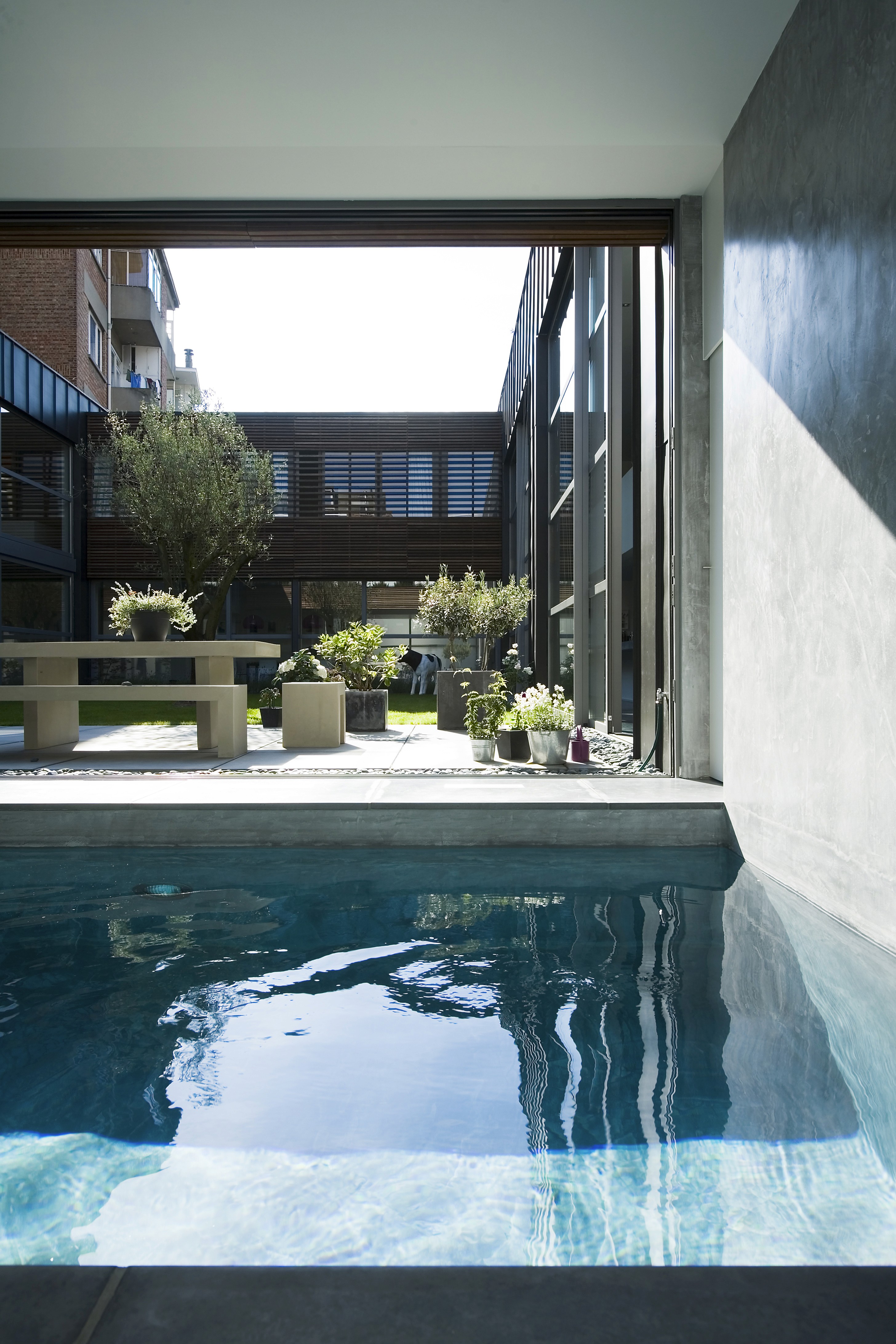 L’utilisation de grandes baies vitrées maximise l’apport de lumière naturelle et offre une vue imprenable sur le patio depuis chaque pièce. Une piscine intérieure, prolongée visuellement par le jardin, constitue un élément central de détente et de bien-être.