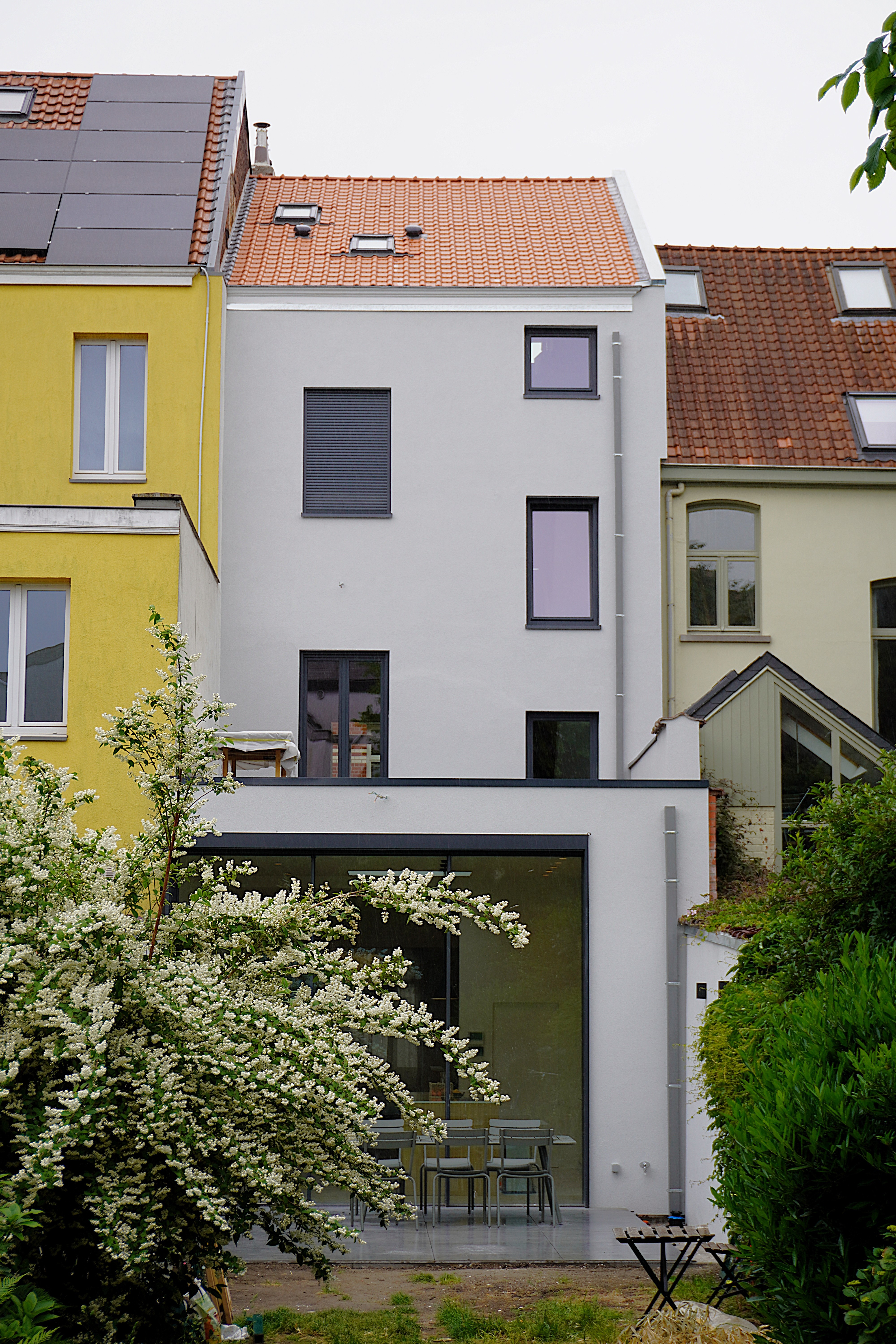 Cette maison unifamiliale souffrait initialement d’annexes arrière non conformes, dont les volumes, bas de plafond et mal conçus, assombrissaient profondément le rez-de-chaussée. Le projet a consisté à repenser ces extensions dans le respect des règles d’urbanisme, tout en révélant le plein potentiel de la maison.