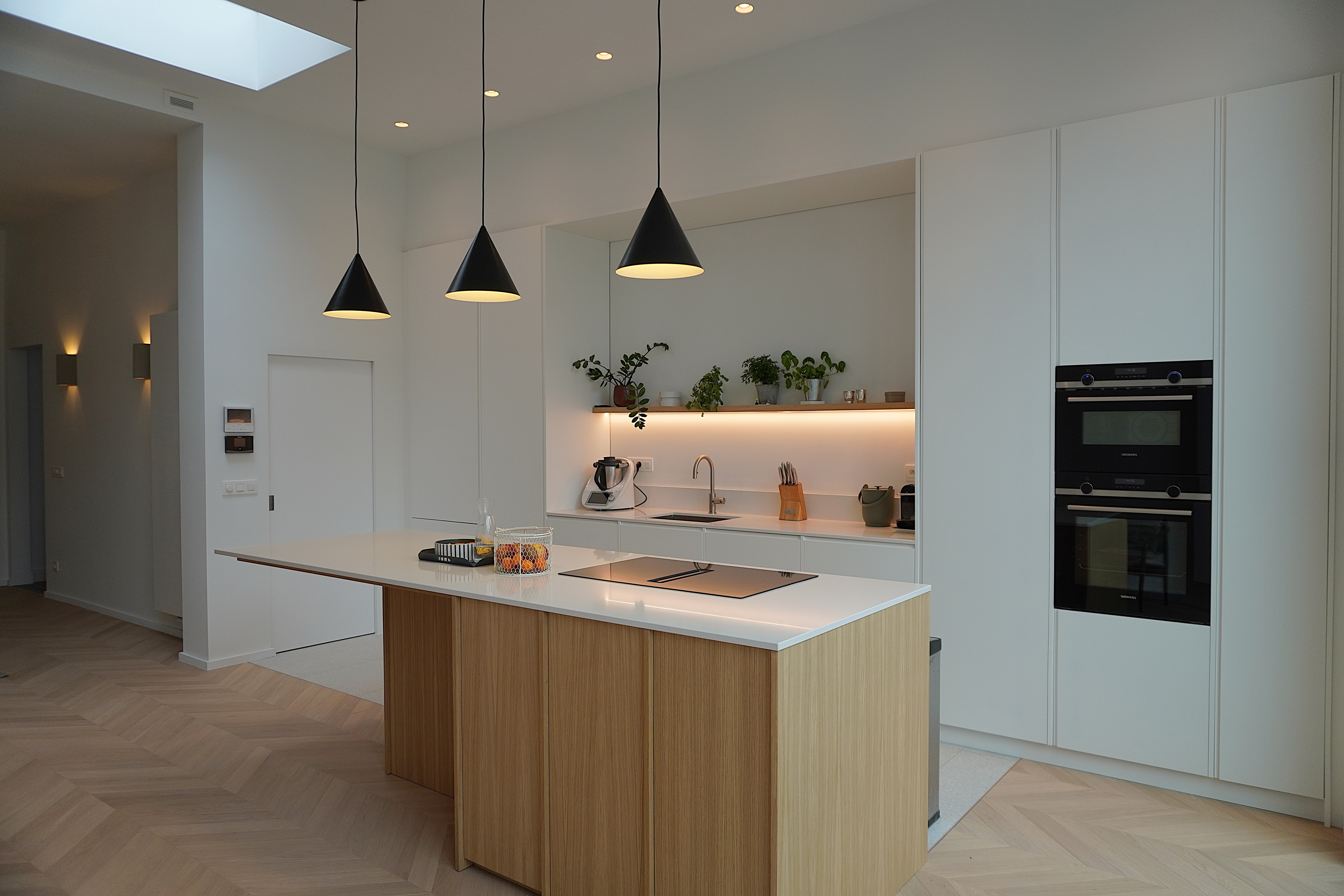 Le nouveau volume permettent une entrée généreuse de lumière naturelle grâce à un triple châssis coulissant minimaliste et une fenêtre de toit plat. L’espace de vie retrouve ainsi clarté et fluidité. L’intégration discrète d’un WC au rez-de-chaussée, a été pensée sans altérer le volume principale.