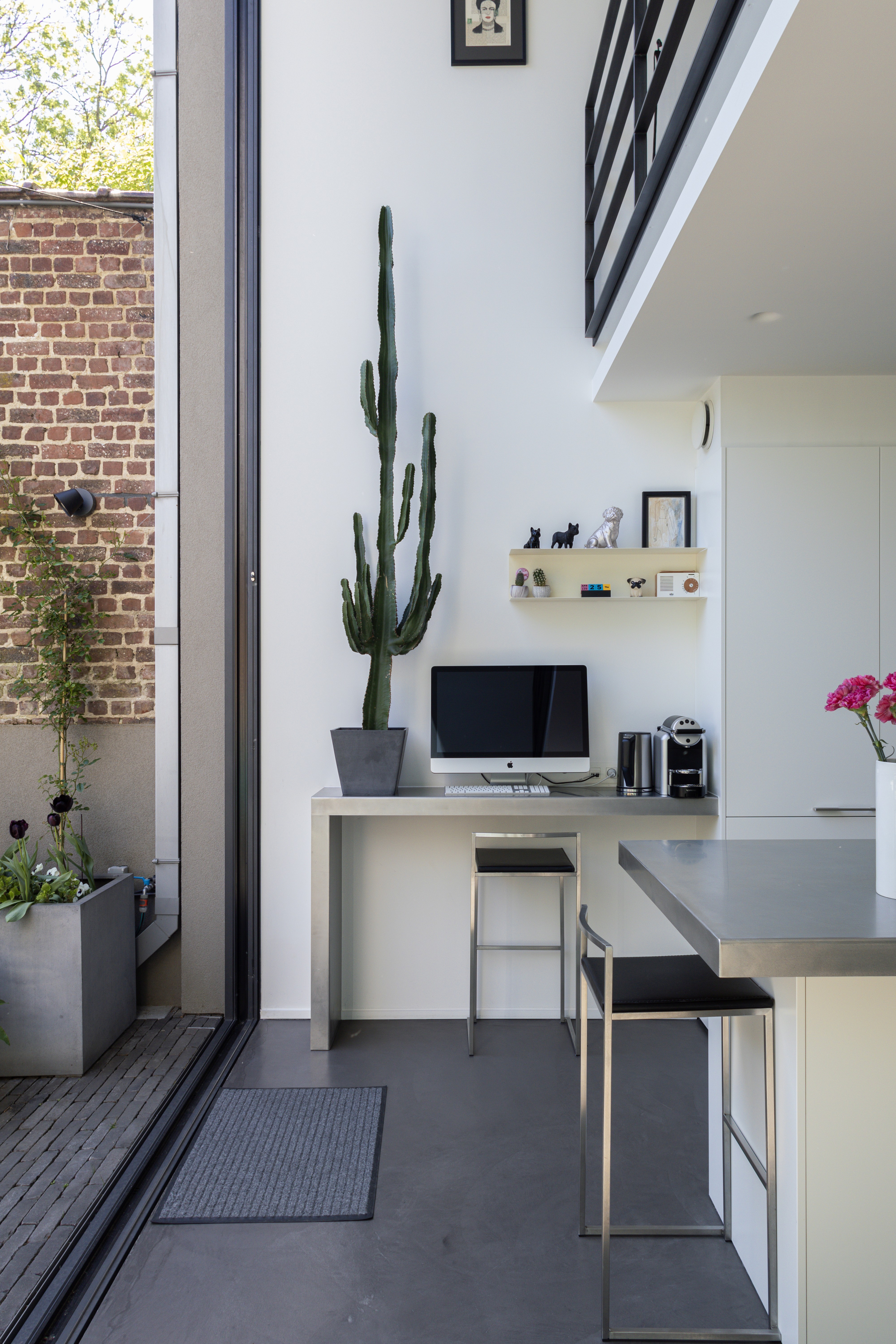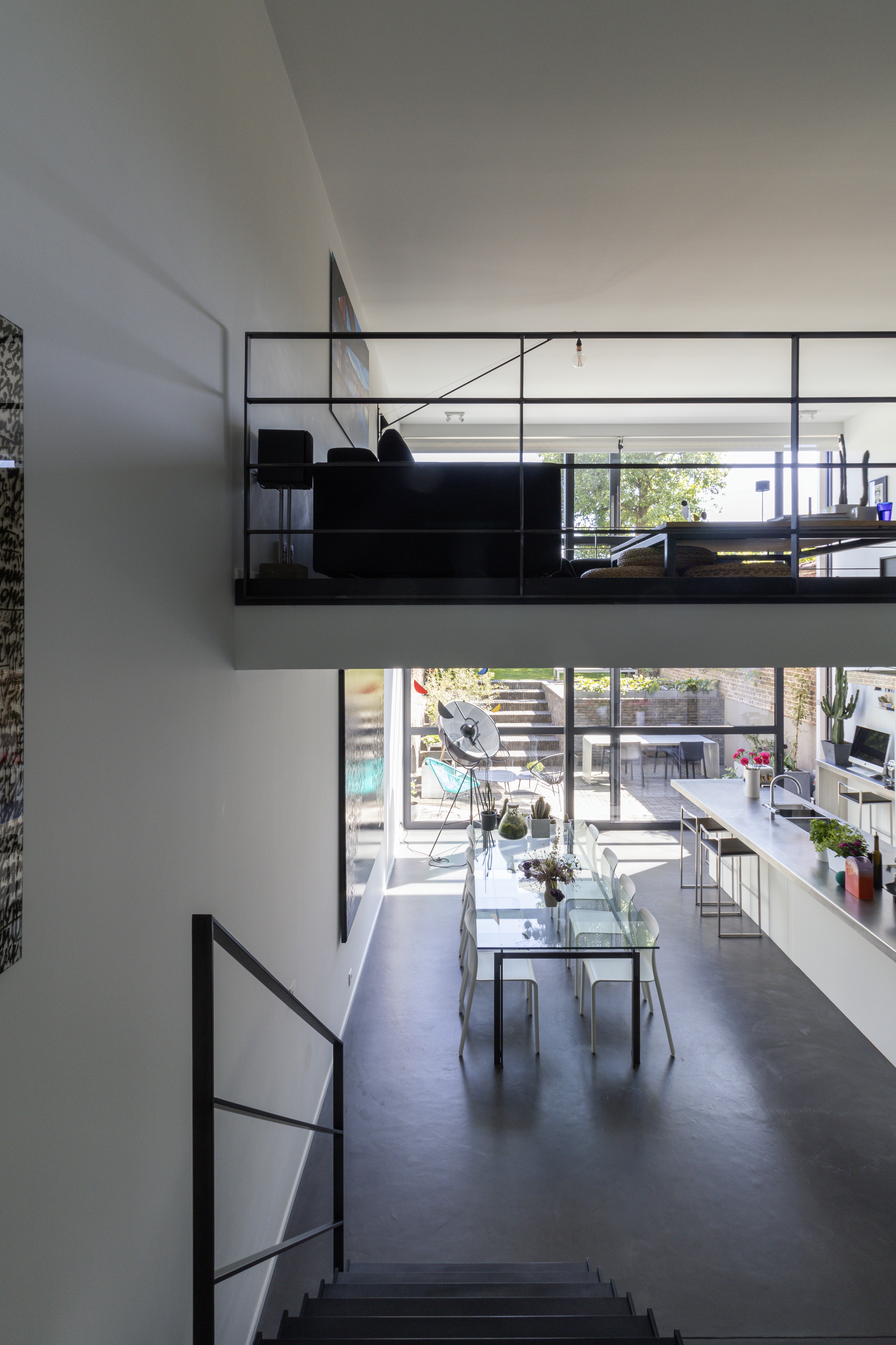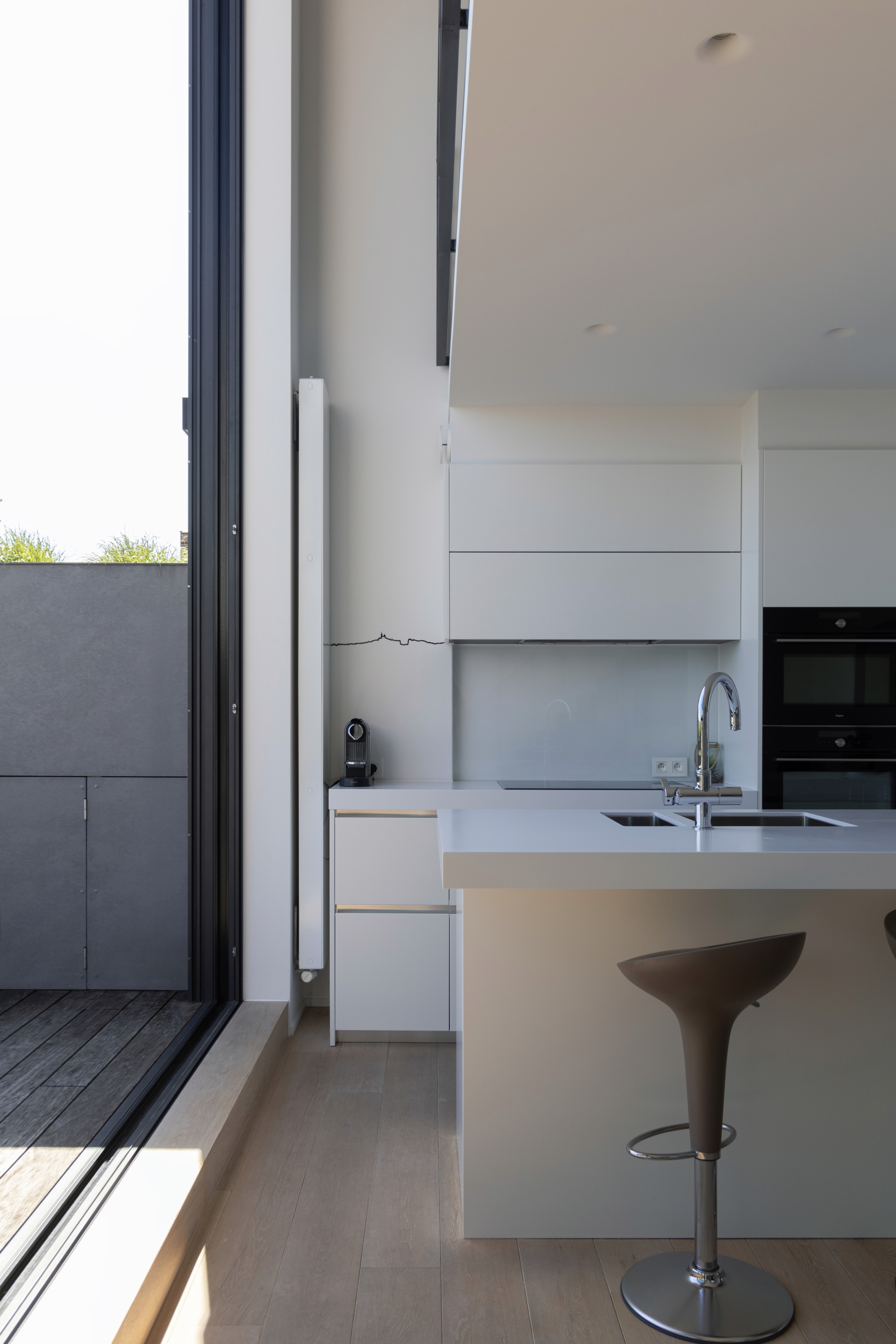 Au sommet du bâtiment, un duplex bénéficie d’une vue imprenable sur Ixelles. Les espaces de vie y ont été conçus pour se tourner vers ce panorama exceptionnel, baignant l’intérieur de lumière et renforçant le lien avec l’environnement urbain.