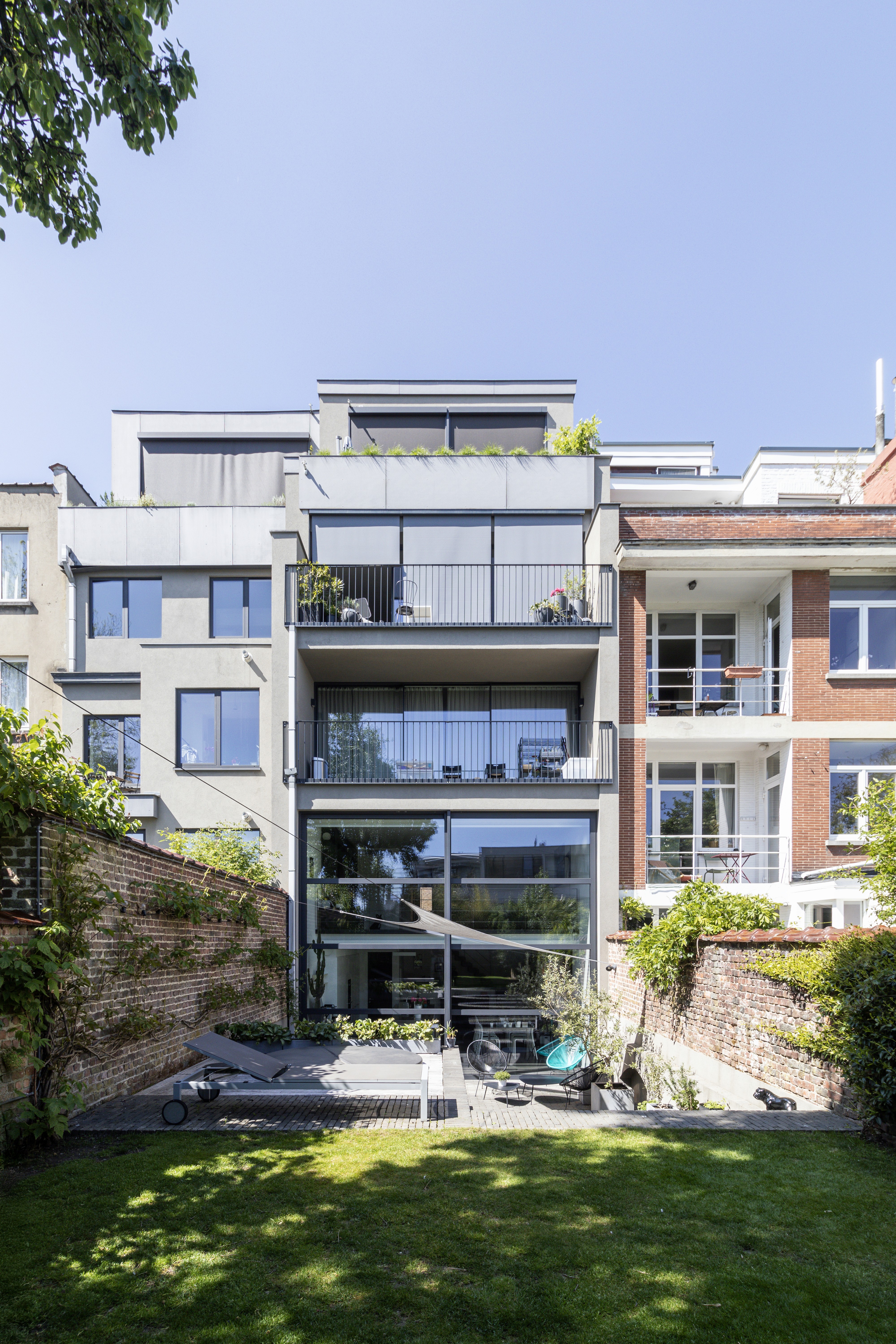 Rénovation d’un immeuble à appartements mitoyen composé de quatre unités, entièrement transformées en espaces contemporains et lumineux. Une nouvelle façade arrière avancée, entièrement vitrée, accompagne une extension sur quatre niveaux, permettant la création de terrasses et l’ouverture vers l’extérieur. L’ensemble du projet vise à améliorer significativement la qualité de vie des habitants tout en garantissant des performances énergétiques remarquables.