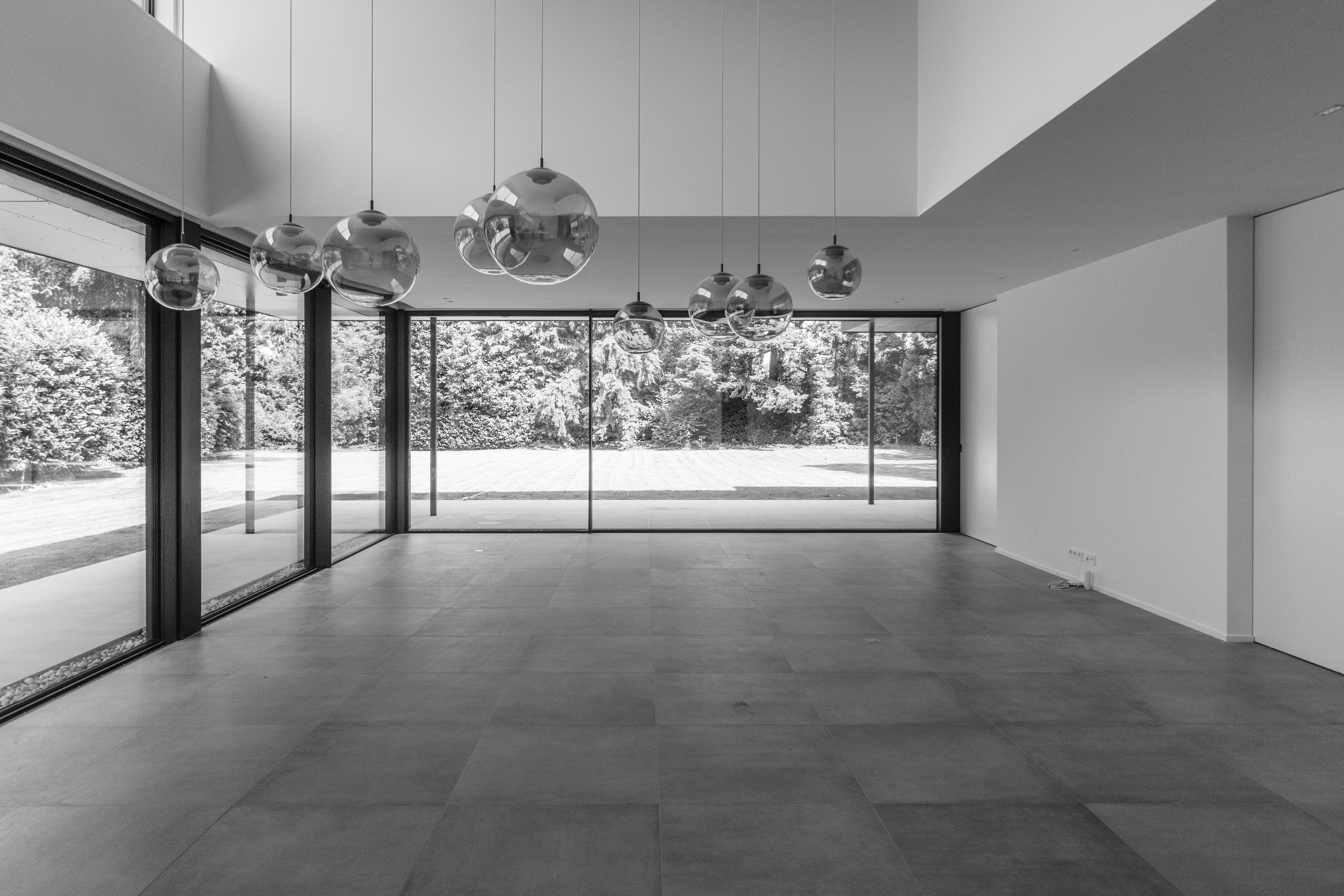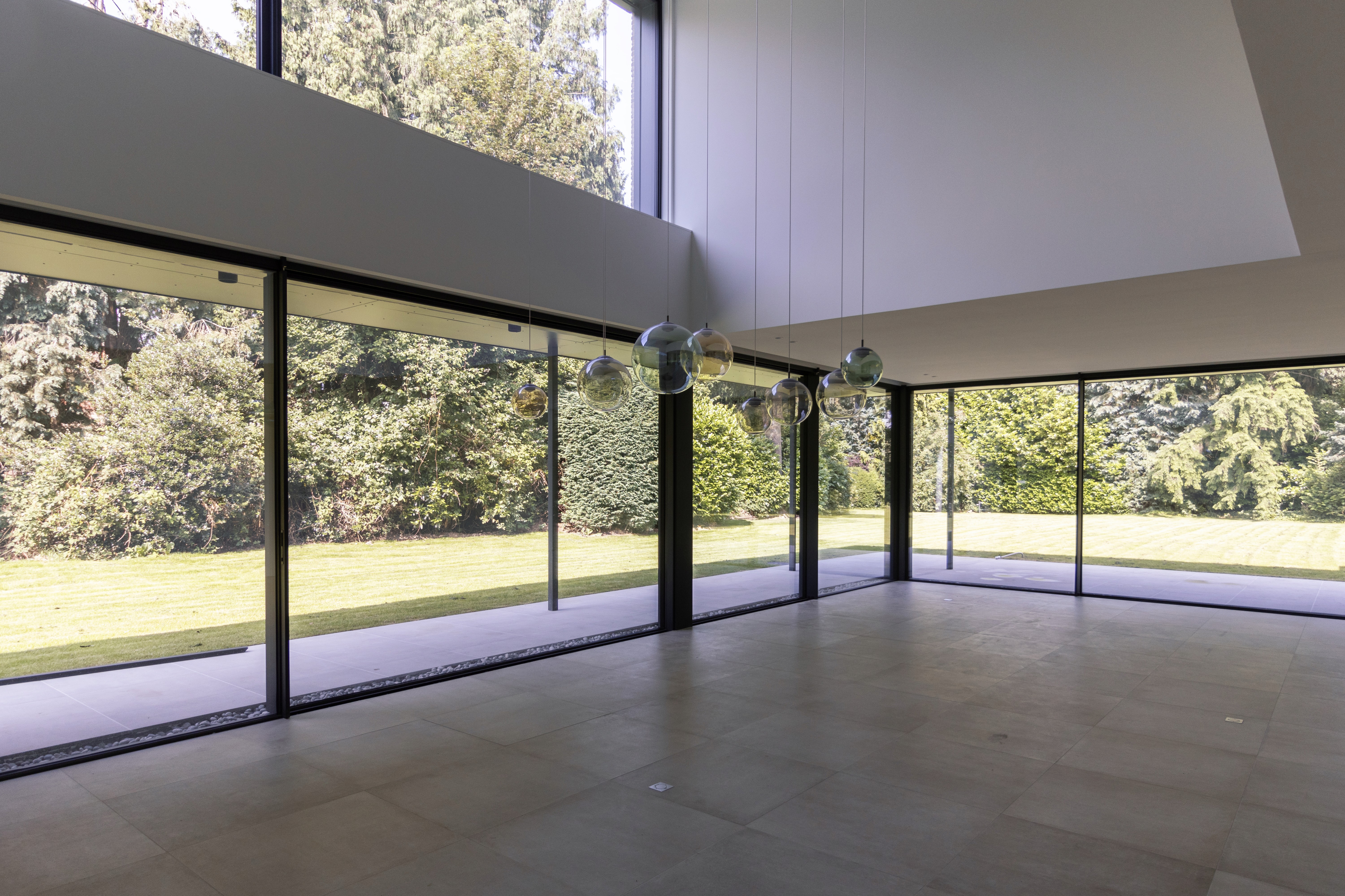 La conception privilégie la transparence et le dialogue entre intérieur et extérieur. De larges baies vitrées, traversant les volumes de part en part, captent un maximum de lumière naturelle et offrent des vues dégagées sur le jardin. Le rez-de-chaussée, largement vitré, efface les frontières entre dedans et dehors, tandis qu’une double hauteur dans le séjour accentue la profondeur des perspectives et la sensation d’espace.